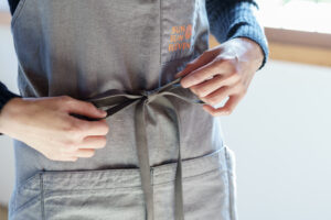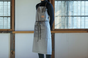 9オンスの綿100%。グレー×ブラックのデニム生地を使った働き方にフィットしたデザインのシンプルなエプロン。胸元に小さなポケットを配置し、ボールペン、名札かけなどに使えます。腰下にあるポケットは大きく4つあり収納力優れるものに。胸ポケットにプリントされたお店のロゴはカラー仕様でしっかりとアクセントに。