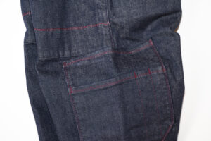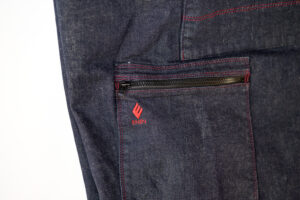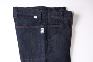 素材はよく伸びる色落の少ない10オンスのスーパーストレッチのデニムを採用。 シンプルなシルエットの中にもポケットの配置は働く動きが計算しつくされていて、おしりとひざ位置を2枚仕立てにし強度をもたせました。コインポケットも広くとり、手がすっぽり入って使いやすい仕様です。作業先から安心の制電対策のアイテムです。自社のロゴは刺繍で配置し主張しすぎない絶妙なサイズも選んでいただきました。