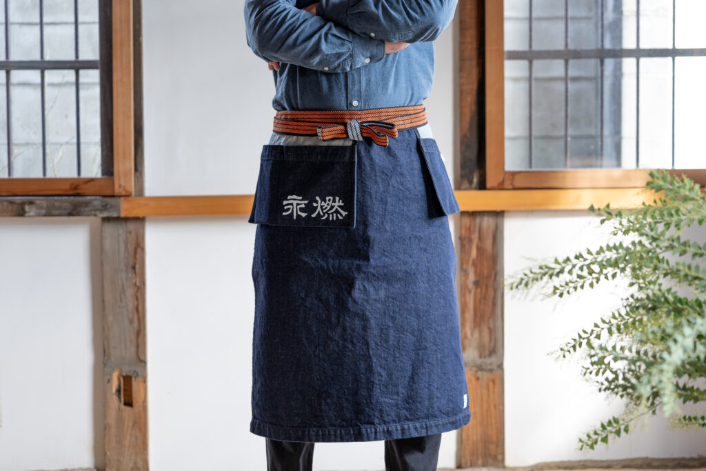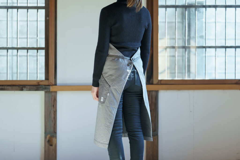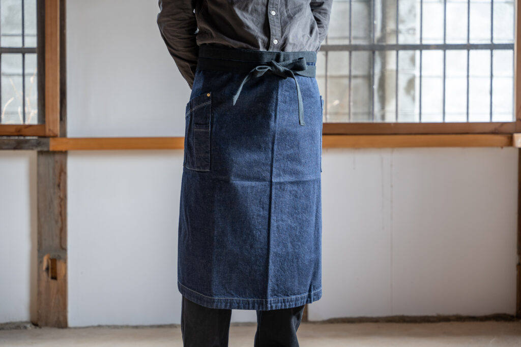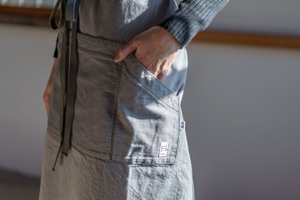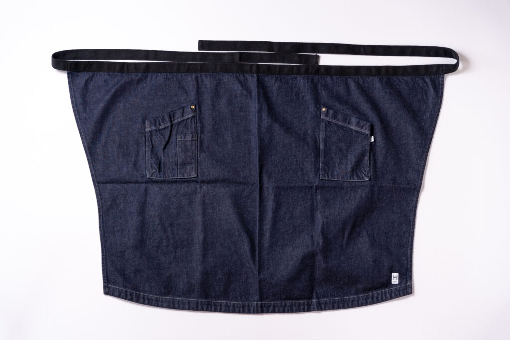 9オンスの綿100%。グレー×ブラックのデニム生地を使った働き方にフィットしたデザインのシンプルなエプロン。胸元に小さなポケットを配置し、ボールペン、名札かけなどに使えます。腰下にあるポケットは大きく4つあり収納力優れるものに。胸ポケットにプリントされたお店のロゴはカラー仕様でしっかりとアクセントに。