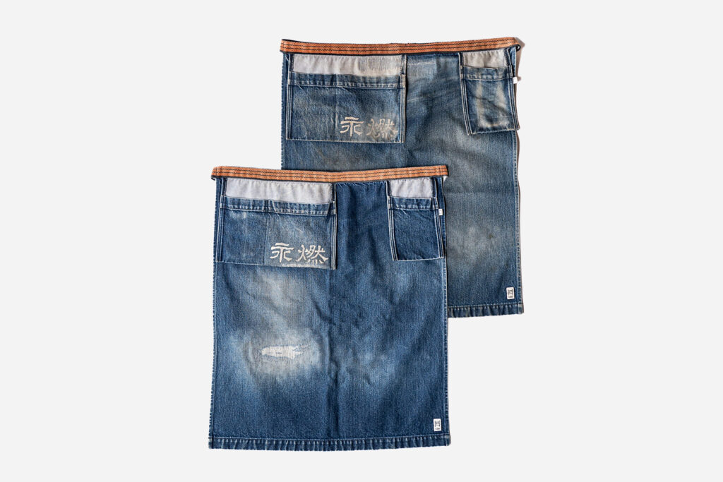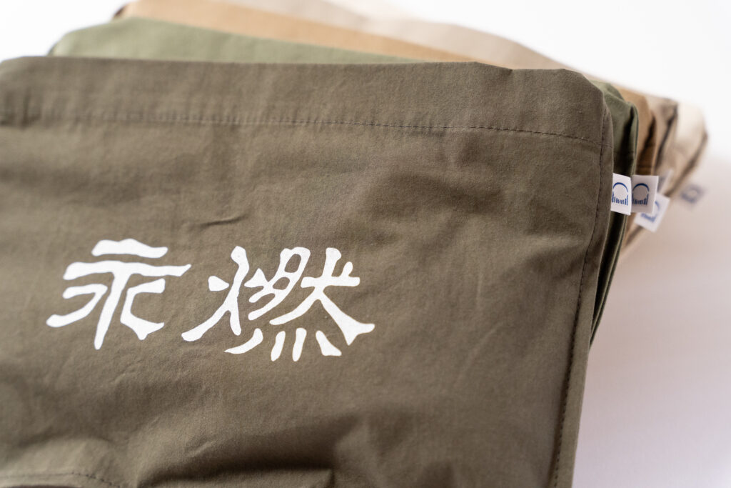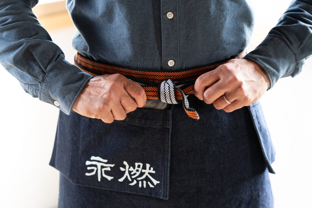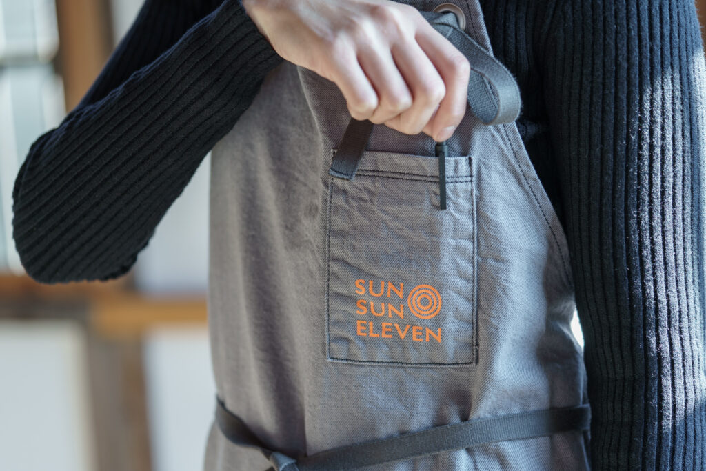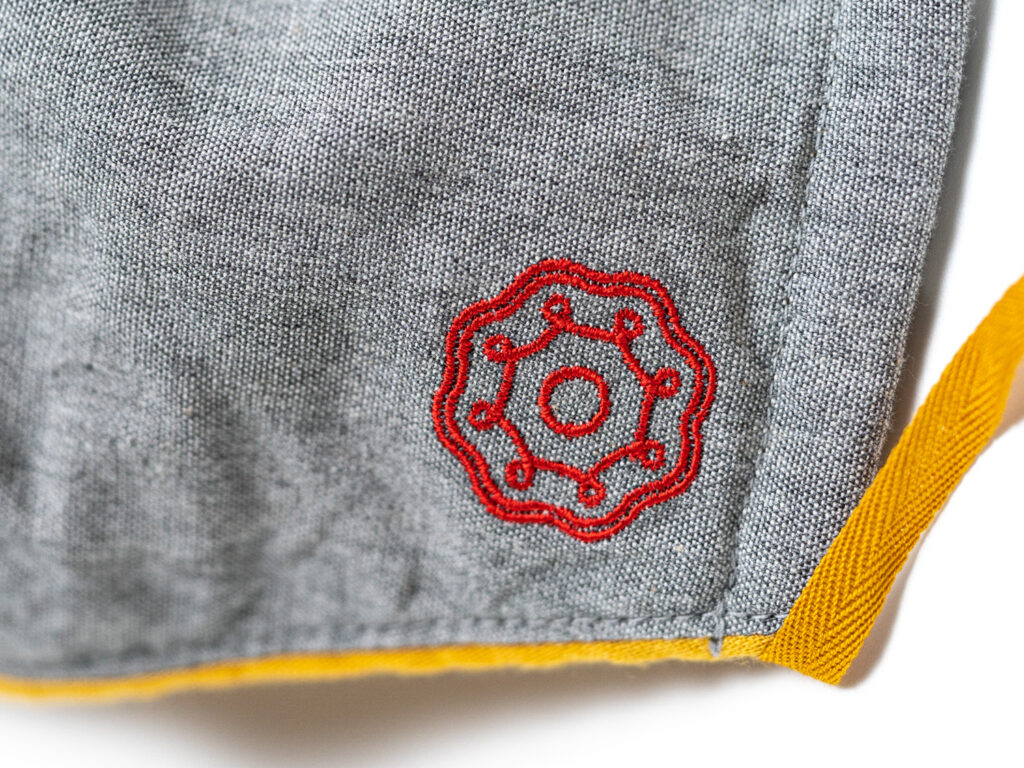 9オンスの綿100%。グレー×ブラックのデニム生地を使った働き方にフィットしたデザインのシンプルなエプロン。胸元に小さなポケットを配置し、ボールペン、名札かけなどに使えます。腰下にあるポケットは大きく4つあり収納力優れるものに。胸ポケットにプリントされたお店のロゴはカラー仕様でしっかりとアクセントに。