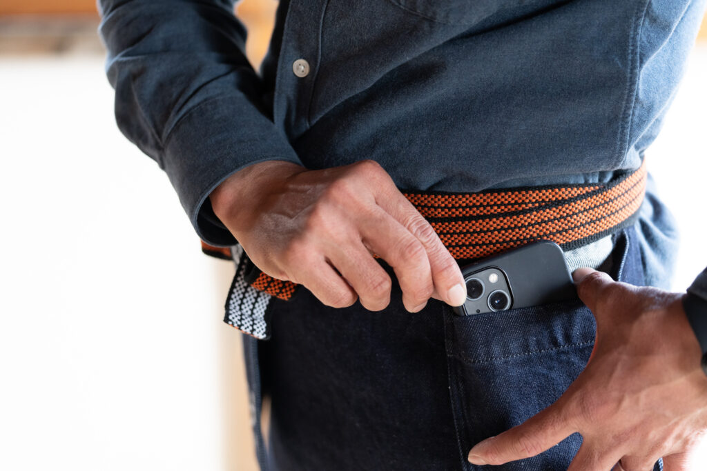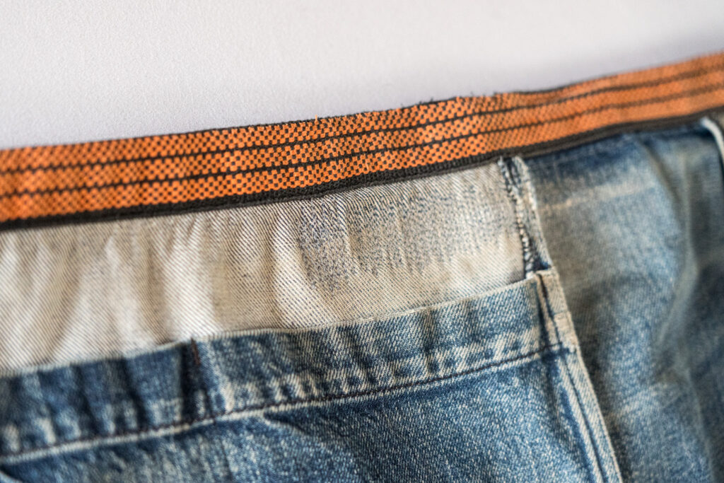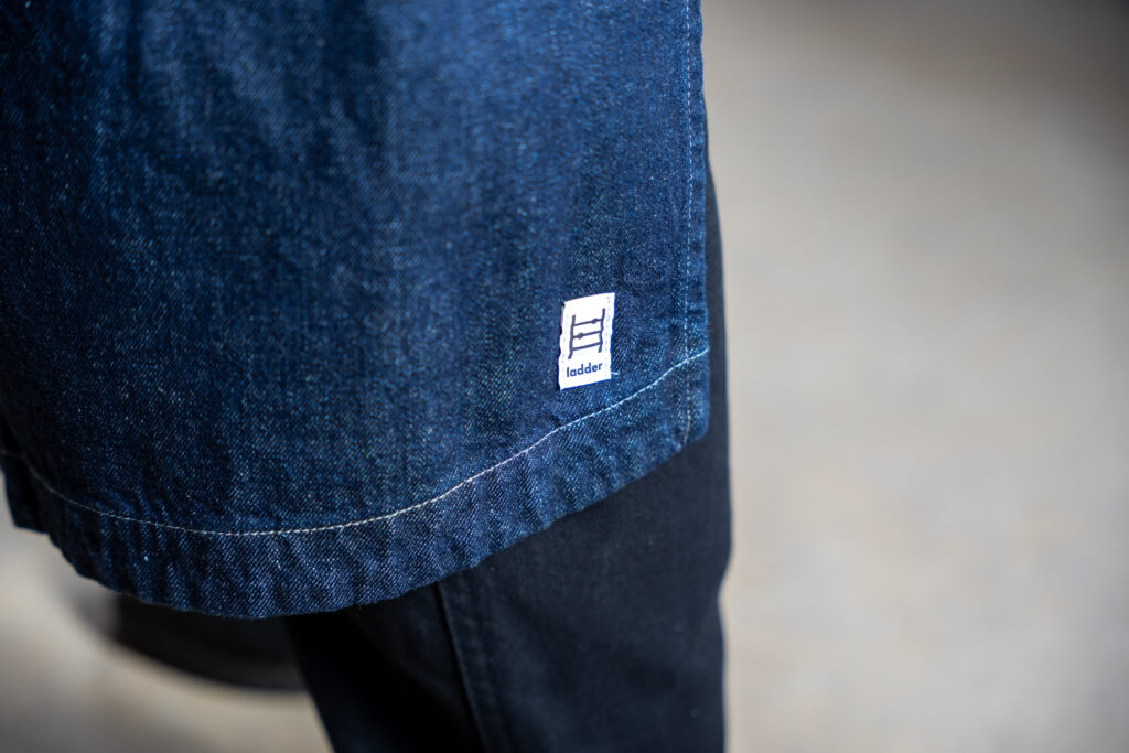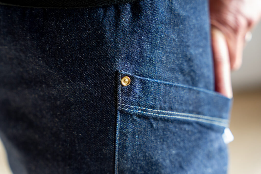 素材は9オンスのスーパーストレッチブラック×ブラックデニム。 現場では動きが多いためそれに対応できるようかなり伸びる素材と、生地の強度の高い、綿、PUのほかにPEも配合された生地を採用しました。パンツは機械操作時、回転物があるので裾はリブ使いで巻き込まれないよう、ポケットは仕事で使用するツールが入り、物が落ちないような角度で配置しひざにも少しゆとりを持たせて動きに対応しました。ジャケットも同じ素材で袖もリブ使い、ポケットも多く配置させ物が落ちにくい角度で設計。フードは襟元に収納できるタイプで採用しました。
